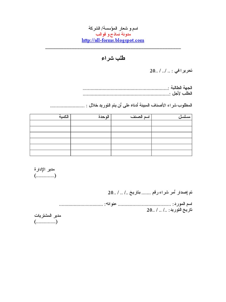 مشتريات نموذج طلب شراء Xls